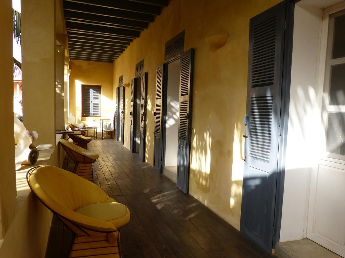 La maison Rihan appartient à la catégorie des «maisons basses» dites aussi portugaises dont il reste environ 250 exemplaires (parmi 1344 constructions) sur l’ile. Située entre la rue Flamand et la rue Khalifa Babacar SY au nord, c’est une maison domestique avec commerce d’un grand intérêt architectural. Ensemble hétérogène en U, construit en briques enduites aujourd’hui de ciment avec un toit à deux pentes en tuiles marseillaises et une hauteur totale de moins de 4 mètres.
